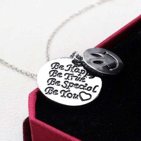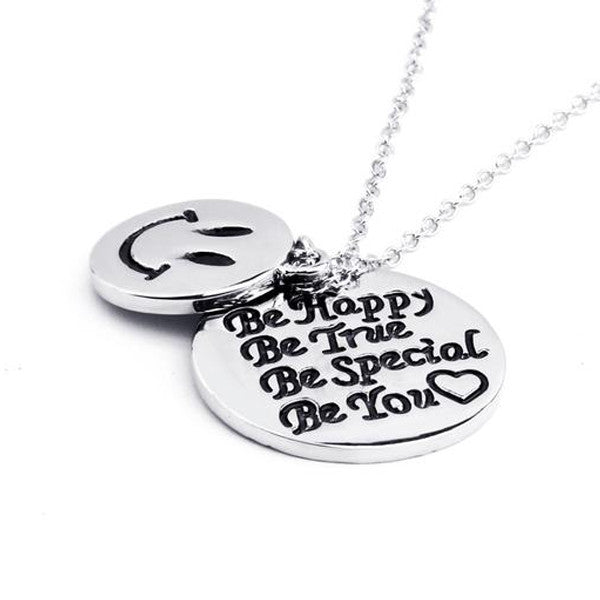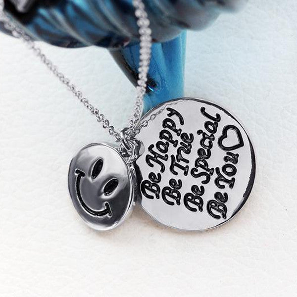 This hand stamped charm pendant is a precious reminder to stay happy and true no matter what life sends your way. This stylish piece comes with 2 circle pendants, one engraved with a smiley face and the other one detailed with the message "Be Happy - Be True - Be Special - Be You". It would make a truly inspiring gift that any woman would love to wear.
