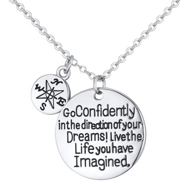 Share the gift of inspiration and encouragement with the one you love most. This charm pendant is a delicate and versatile piece that anyone would adore wearing. Great to match any outfit and beautifully detailed with hand stamped engravings that say "Go Confidently in the direction of your Dreams! Live the Life you have imagined". A smaller compass pendant adds a touch of character and flare, making this charm pendant the perfect gift for any special occasion!