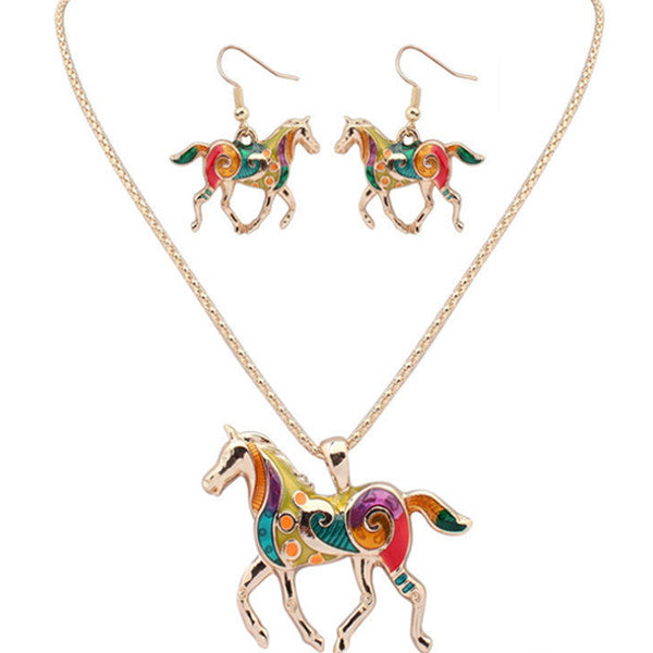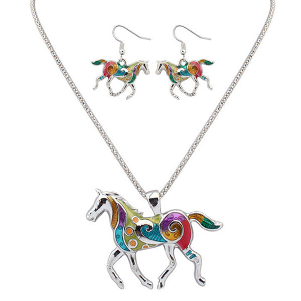 This unique Horse Hippie Pendant Set are the perfect accessories to express your individuality. Show your love for horses with this multi-colored horse pendant set. This one of a kind necklace and earrings set is a must have and makes a great gift!