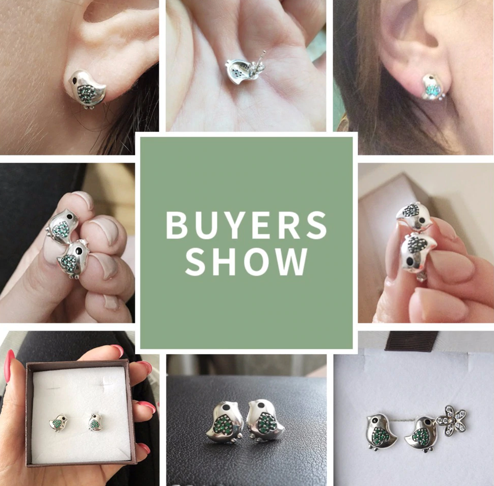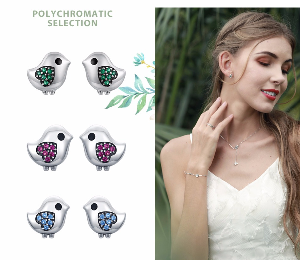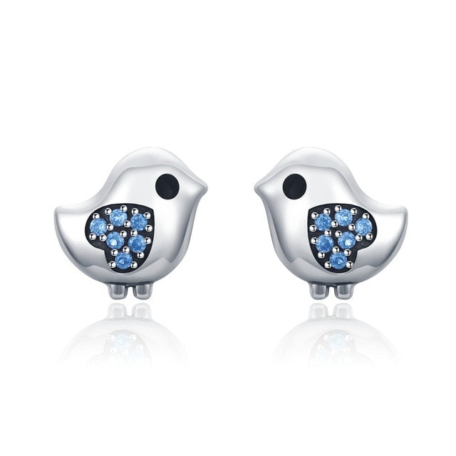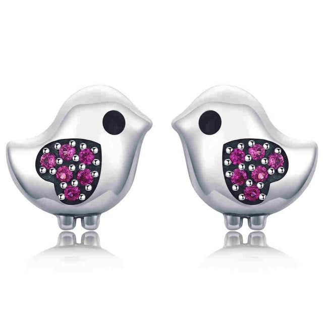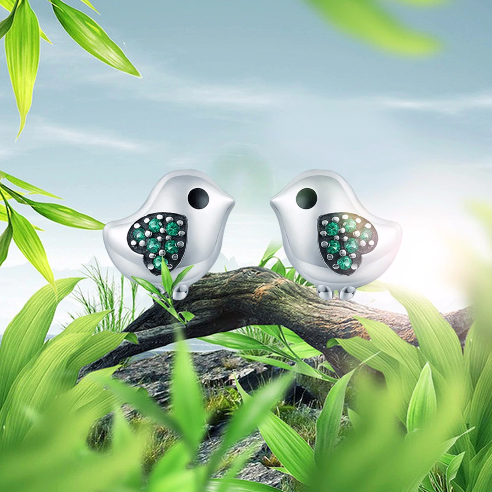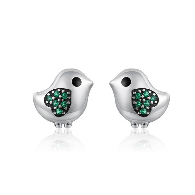 925 Sterling Silver Lovely Little Bird Clear CZ Green Heart Stud Earrings