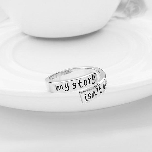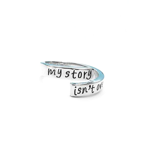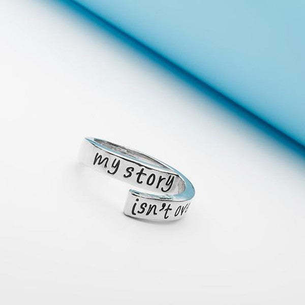 Carefully hand-stamped with the words "My story isn't over yet", this hand stamped ring is a symbol of strength and overcoming obstacles. Designed with an adjustable fit, this piece makes a truly inspirational gift. Easy to style, wear and raise awareness every single day.